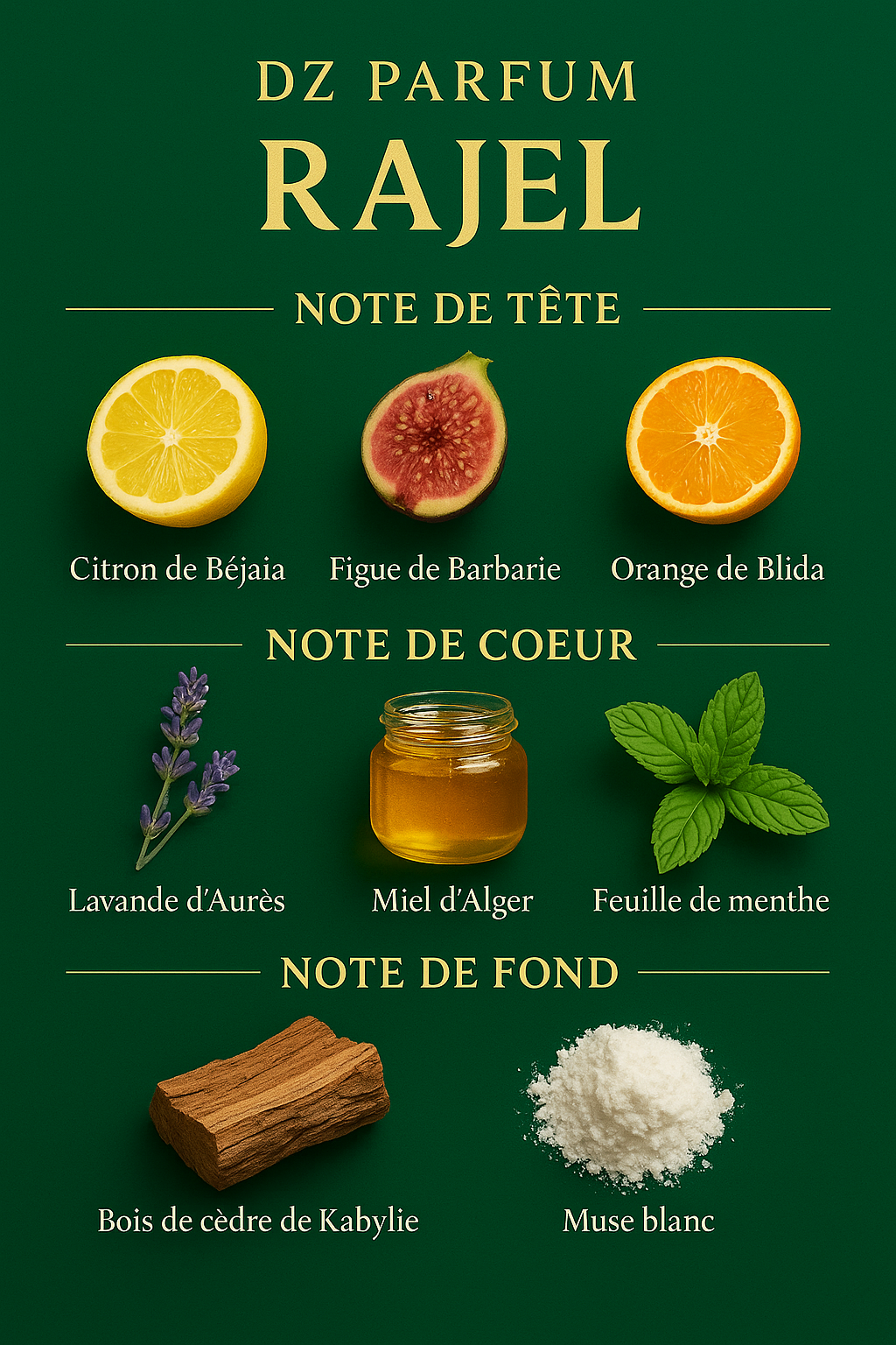 Rajel, c’est plus qu’un parfum : c’est une déclaration de fierté algérienne. Pensé pour l’homme qui assume son drapeau avec élégance, il puise sa force dans la terre d’Algérie avec des notes puissantes et chaleureuses :